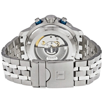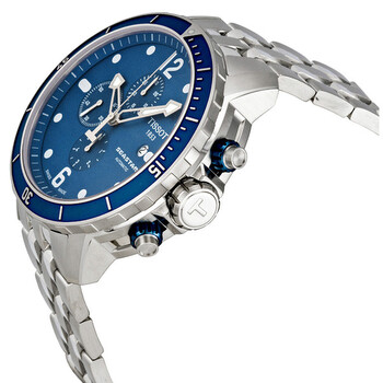 Stainless steel case with a stainless steel bracelet. Uni-directional rotating blue PVD bezel. Blue dial with luminous hands and dot hour markers. Arabic numerals mark the 6 and 12 o'clock positions. minute markers around the outer rim. Dial Type: Analog. Luminescent hands and markers. Date display at the 3 o'clock position. Chronograph - three sub-dials displaying: 60 second, 60 minute and 12 hour. Automatic movement. Eta c01.211 engine. Scratch resistant sapphire crystal. Skeleton case back. Case diameter: 48 mm. Case thickness: 17 mm. Round case shape. Band width: 22 mm. Fold over with safety release clasp. Water resistant at 300 meters / 990 feet. Functions: date, hour, minute, second. Casual watch style. Watch label: Swiss Made. Item Variations: T066 427 11 047 00, T066-427-11-047-00, T066/427/11/047/00, T0664271104700. Tissot Seastar Chronograph Blue Dial Men's Watch T066.427.11.047.00.