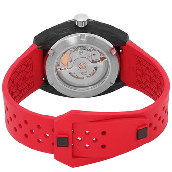 Black and grey marbled forged carbon case with a rubber strap. Uni-directional rotating silver-tone stainless steel bezel with an inlaid black ring. Black dial with silver-tone hands and index-Arabic numeral hour markers. Minute markers around the outer rim. Dial Type: Analog. Luminescent hands and markers. Date display at the 3 o'clock position. Powermatic 80.111 Automatic movement, containing 23 Jewels, bitting at 28800 vph, and has a power reserve of approximately 80 hours. Scratch resistant sapphire crystal. Screw down crown. Transparent case back. Tonneau case shape, case size: 41 mm, case thickness: 14.4 mm. Band width: 20 mm. Quick release clasp. Water resistant at 300 meters / 1000 feet. Functions: date, hour, minute, second. Sideral S Powermatic 80 Series. Casual watch style. Watch label: Swiss Made. Tissot Sideral S Powermatic 80 Automatic Black Dial Men's Watch T145.407.97.057.02.