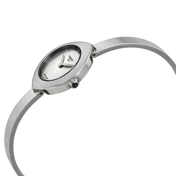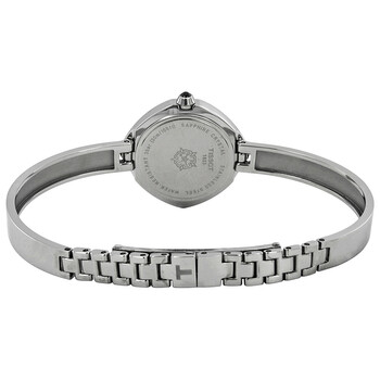 Silver-tone stainless steel case with a silver-tone stainless steel bangle bracelet. Fixed silver-tone stainless steel bezel. Silver (crystal-set) dial with grey hands and crystal hour markers. No markers. Dial Type: Analog. Quartz movement. Scratch resistant sapphire crystal. Pull / push crown. Solid case back. Unique case shape. Fold over with safety release clasp. Water resistant at 30 meters / 100 feet. Functions: hour, minute. Casual watch style. Watch label: Swiss Made. Tissot Silver Dial Stainless Steel Ladies Watch T1131091033600.