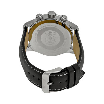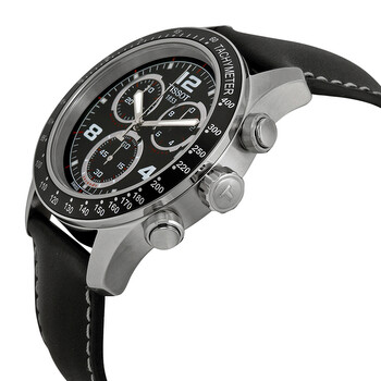 Stainless steel case with a black leather strap. Fixed stainless steel bezel with a black ion-plated top ring showing tachymeter markings. Black dial with luminous hands and index hour markers. Arabic numerals mark the 4, 8 and 12 o'clock positions. Minute markers around the outer rim. Dial Type: Analog. Luminescent hands and markers. Date display at the 3 o'clock position. Chronograph - three sub-dials displaying: 60 second, 30 minute and 1/10th of a second. ETA caliber G10.211 quartz movement. Scratch resistant sapphire crystal. Pull / push crown. Solid case back. Case size: 42.5 mm. Case thickness: 11 mm. Round case shape. Band width: 21 mm. Band length: 8 inches. Tang clasp. Water resistant at 100 meters / 330 feet. Functions: chronograph, date, hour, minute, second, tachymeter. Sport watch style. Watch label: Swiss Made. Item Variations: T039 417 16 057 02, T039-417-16-057-02, T039/417/16/057/02, T0394171605702. Tissot Sport V8 Black Dial Black Leather Men's Watch T039.417.16.057.02.
