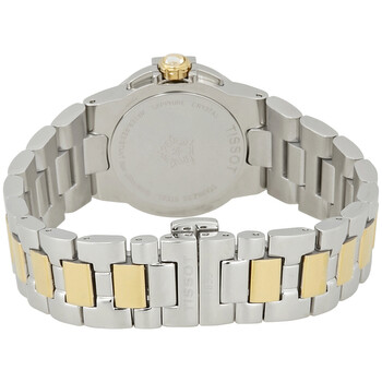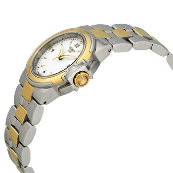 Silver-tone stainless steel case with a two-tone (silver-tone and yellow gold PVD ) stainless steel bracelet. Fixed silver-tone stainless steel with a yellow gold PVD ring bezel. White dial with luminous yellow gold-tone hands and index hour markers. Arabic numerals mark the 6, 9 and 12 o'clock positions. minute markers around the outer rim. Dial Type: Analog. Luminescent hands. Date display at the 3 o'clock position. ETA Caliber F04.111 quartz movement. Scratch resistant sapphire crystal. Pull / push crown. Solid case back. Round case shape. Case size: 30 mm. Water resistant at 50 meters / 165 feet. Functions: date, hour, minute, second. Sport watch style. Watch label: Swiss Made. Tissot Sport-T White Dial Ladies Watch T080.210.22.017.00.