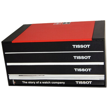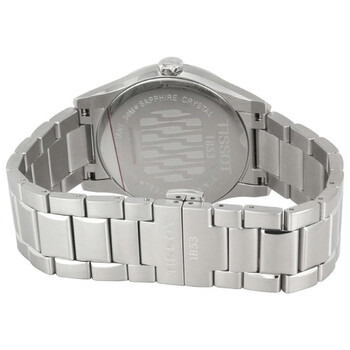 Stainless steel case with a stainless steel bracelet. Fixed stainless steel bezel. White dial with silver-tone hands and index hour markers. Arabic numerals mark the 3, 6, 9 and 12 o'clock positions. Minute markers around the outer rim. Dial Type: Analog. Date display at the 4 o'clock position. Quartz movement. Scratch resistant sapphire crystal. Pull / push crown. Solid case back. Case diameter: 40 mm. Case thickness: 7 mm. Round case shape. Band width: 20 mm. Band length: 8 inches. Push button hidden clasp. Water resistant at 30 meters / 100 feet. Functions: date, hours, minutes, seconds. Additional Info: withstands rain and splashes of water, but not showering or submersion. Sport watch style. Watch label: Swiss made. Item Variations: T0284101103700. Tissot Stylis T Men's Watch T028.410.11.037.00.
