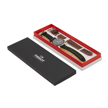 Silver-tone stainless steel case with a black leather with a textile top strap. Fixed silver-tone stainless steel bezel with black aluminium ring showing tachymeter markings. Black dial with silver-tone hands and index hour markers. Minute markers around the outer rim. Dial Type: Analog. Luminescent hands and markers. Date display above the 6 o'clock position. Chronograph - three sub-dials displaying: 60 second, 30 minute and 1/10th of a second. ETA Caliber G10.212 quartz movement. Scratch resistant sapphire crystal. Pull / push crown. Solid case back. Round case shape, case size: 45.5 mm, case thickness: 11.9 mm. Band width: 22 mm. Buckle clasp. Water resistant at 100 meters / 330 feet. Functions: chronograph, rattrapante, date, hour, minute, small second. Supersport Series. Sport watch style. Watch label: Swiss Made. Tissot Supersport Chronograph Quartz Black Dial Men's Watch T125.617.17.051.00.