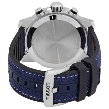 Silver-tone stainless steel case with a black, blue textile strap. Fixed stainless steel bezel with black aluminium ring showing tachymeter markings. Black dial with luminous grey hands and index hour markers. Minute markers around the outer rim. Dial Type: Analog. Luminescent hands and markers. Date display at the 6 o'clock position. Chronograph - three sub-dials displaying: 60 second, 30 minute and 1/10th of a second. ETA caliber G10.212 quartz movement. Scratch resistant sapphire crystal. Pull / push crown. Solid case back. Round case shape. Case size: 45.5 mm. Case thickness: 11.9 mm. Band width: 22 mm. Tang clasp. Water resistant at 100 meters / 330 feet. Functions: chronograph, rattrapante, date, hour, minute, small second. Supersport Series. Sport watch style. Watch label: Swiss Made. Tissot Supersport Chronograph Quartz Black Dial Men's Watch T125.617.17.051.03.