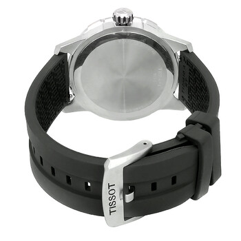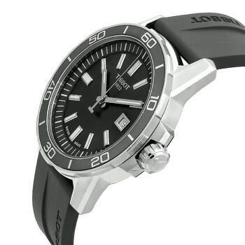 Stainless steel case with a grey rubber strap. Fixed stainless steel bezel with an inlaid grey aluminum ring. Grey dial with luminous silver-tone hands and index hour markers. Minute markers around the outer rim. Dial Type: Analog. Luminescent hands and markers. Date display at the 3 o'clock position. ETA caliber F06.115 quartz movement. Scratch resistant sapphire crystal. Pull / push crown. Solid case back. Round case shape. Case size: 44 mm. Case thickness: 10 mm. Band width: 22 mm. Tang clasp. Water resistant at 100 meters / 330 feet. Functions: date, hour, minute, second, battery eol indicator. Supersport Series. Sport watch style. Watch label: Swiss Made. Tissot Supersport Quartz Grey Dial Men's Watch T125.610.17.081.00.