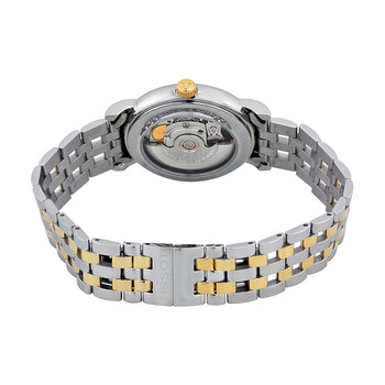 Stainless steel case with a two-tone (silver and gold-tone) stainless steel bracelet. Fixed stainless steel bezel. Black dial with gold tone hands and stick hour markers hour markers. Minute markers around the outer rim. Dial Type: Analog. Luminescent hands and dial markers. Date display at the 3 o'clock position. Automatic movement. Scratch resistant sapphire crystal. Gold-tone crown. Skeleton case back. Case diameter: 35 mm. Round case shape. Deployment clasp. Water resistant at 30 meters / 100 feet. Functions: hours, minutes, seconds, date. Sport watch style. Watch label: Swiss made. Tissot T Classic Carson Men's Watch T95.2.483.51.