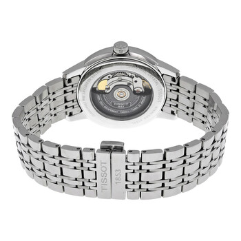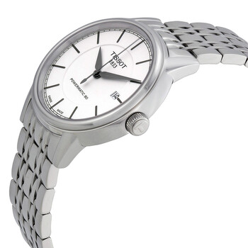 Silver-tone stainless steel case with a silver-tone stainless steel bracelet. Fixed silver-tone stainless steel bezel. White dial with silver-tone alpha-style shape hands and index hour markers. Minute markers around the outer rim. Dial Type: Analog. Date display at the 3 o'clock position. Tissot Calibre Powermatic 80 (C07.111) Automatic movement, based upon ETA 2824-2, containing 23 Jewels, bitting at 21600 vph, and has a power reserve of approximately 80 hours. Scratch resistant sapphire crystal. Pull / push crown. Skeleton case back. Round case shape, case size: 40 mm, case thickness: 9.6 mm. Band width: 17.8 mm, band length: 7 inches. Deployment clasp. Water resistant at 30 meters / 100 feet. Functions: date, hour, minute, second. Casual watch style. Watch label: Swiss Made. Tissot T Classic Powermatic Automatic White Dial Men's Watch T0854071101100.