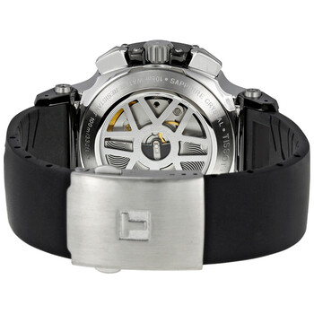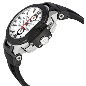 Stainless steel case with a black rubber strap. Black PVD bezel. White dial with luminous hands and index hour markers. Arabic numeral marks the 6 and 12 o'clock positions. Minute markers. Tachymeter around the outer rim. Dial Type: Analog. Luminescent hands and markers. Date display at the 3 o'clock position. Automatic movement. Scratch resistant sapphire crystal. Solid case back. Case diameter: 47 mm. Tang clasp. Water resistant at 100 meters / 330 feet. Sport watch style. Watch label: Swiss Made. Tissot T Race Chronograph Black Rubber Strap Men's Watch T0484272703700.