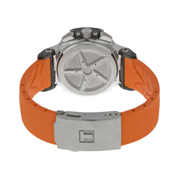 Stainless steel case with a orange silicone strap. Black ion-plated bezel. Black dial with silver-tone hands and index hour markers. Arabic numerals mark the 6, 9 and 12 o'clock position. Minute markers. Tachymeter around the outer rim. Dial Type: Analog. Luminescent hands. Date display at the 3 o'clock position. Chronograph - three sub-dials displaying: 30 minutes, 60 seconds and 1/10 seconds. ETA G15.211 quartz movement. Scratch resistant sapphire crystal. Pull / push crown. Solid case back. Case size: 36 mm. Case thickness: 12 mm. Round case shape. Band width: 16 mm. Deployment clasp. Water resistant at 100 meters / 330 feet. Functions: hours, minutes, seconds, 1/10 seconds, chronograph and date. Casual watch style. Watch label: Swiss Made. Item Variations: T048 217 27 057 00, T048-217-27-057-00, T048/217/27/057/00, T0482172705700. Tissot T Race Chronograph Orange Silicone Ladies Watch T0482172705700.