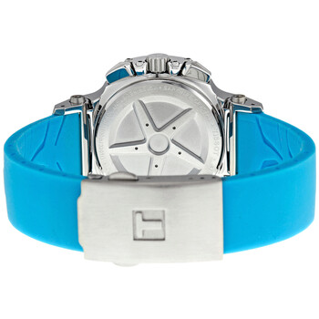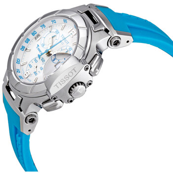 Stainless steel case with a sky blue silicone strap. Stainless steel bezel. White dial with silver-tone hands and index hour markers. Arabic numerals mark the 6, 9 and 12 o'clock position. Minute markers. Tachymeter around the outer rim. Dial Type: Analog. Luminescent hands and markers. Date display at the 3 o'clock position. Chronograph - three sub-dials displaying: 60 seconds, 30 minutes and 1/10th of a second. Quartz movement. Scratch resistant sapphire crystal. Push / pull crown. Solid case back. Case diameter: 36 mm. Case thickness: 12 mm. Band width: 16 mm. Band length: 7 inches. Deployment clasp. Water resistant at 100 meters / 330 feet. Functions: hours, minutes, seconds, 1/10 seconds, chronograph and date. Sport watch style. Watch label: Swiss Made. Tissot T Race Chronograph Sky Blue Silicone Strap Ladies Watch T0482171701702.