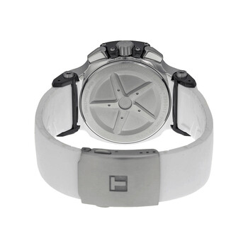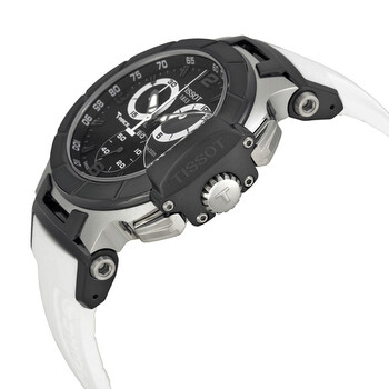 Stainless steel case with a white rubber strap. Fixed black ion-plated bezel. Black dial with silver-tone hands and index hour markers. Arabic numerals mark the 6, 9 and 12 o'clock positions. Minute markers. Tachymeter around the outer rim. Dial Type: Analog. Luminescent hands. Date display at the 3 o'clock position. Chronograph - three sub-dials displaying: 30 minutes, 60 seconds and 1/10 seconds. Quartz movement. Scratch resistant sapphire crystal. Push / pull crown. Solid case back. Case diameter: 45 mm. Case thickness: 12 mm. Band width: 21 mm. Band length: 8 inches. Deployment clasp. Water resistant at 100 meters / 330 feet. Functions: hours, minutes, seconds, chronograph, date, tachymeter. Casual watch style. Watch label: Swiss Made. Tissot T Race Chronograph White Rubber Strap Men's Watch T0484172705705.