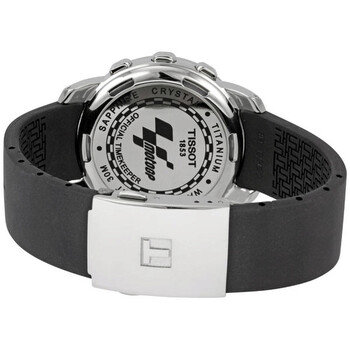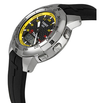 Titanium case with a black rubber strap. Compass bezel. Black tactile dial with luminous hands and Arabic numeral / index hour markers. Minute markers around the outer rim. Perpetual calendar. Quartz movement. Scratch resistant sapphire crystal. Solid case back. Case diameter: 42 mm. Case thickness: 12 mm.Deployment clasp. Water resistant at 30 meters/ 100 feet. Functions: hours, minutes, seconds, calendar, chronograph, alimeter, barometer, thermometer, compass, alarm. Tissot T Touch Men's Watch T33.7.898.94.