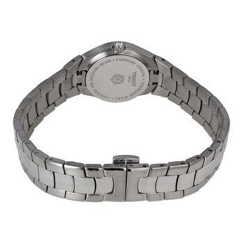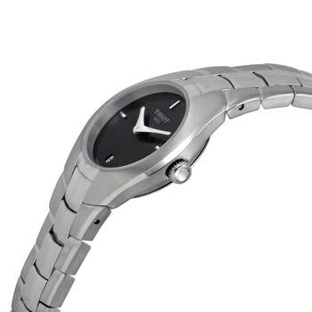 Stainless steel case with a stainless steel bracelet. Fixed stainless steel bezel. Black dial with silver-tone hands. Index markers at the 3, 9 and 12 o'clock positions. Dial Type: Analog. Date display at the 6 o'clock position. ETA caliber F03.111 quartz movement. Scratch resistant sapphire crystal. Pull / push crown. Solid case back. Case size: 25.9 mm. Case thickness: 6.25 mm. Round case shape. Butterfly clasp. Water resistant at 50 meters / 165 feet. Functions: date, hour, minute. Additional Info: suitable for use around household sinks playing sports and swimming in shallow water but not bathing snorkeling or scuba diving. Dress watch style. Watch label: Swiss Made. Tissot T Trend T Round Black Dial Ladies Watch T0960091112100.