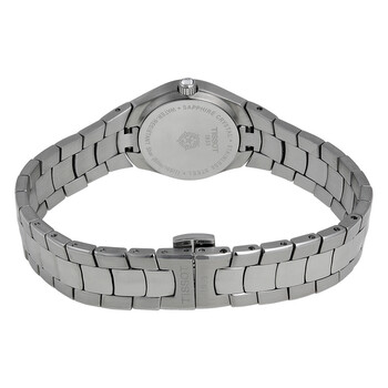 Stainless steel case with a stainless steel bracelet. Fixed stainless steel bezel. Blue mother of pearl dial with silver-tone hands. Index markers at the 3, 9 and 12 o'clock positions. Dial Type: Analog. Date display at the 6 o'clock position. ETA Caliber F03.111 quartz movement. Scratch resistant sapphire crystal. Pull / push crown. Solid case back. Case size: 25.9 mm. Case thickness: 6.25 mm. Round case shape. Butterfly clasp. Water resistant at 50 meters / 165 feet. Functions: date, hour, minute. Dress watch style. Watch label: Swiss Made. Tissot T Trend T Round Blue Dial Ladies Watch T0960091113100.