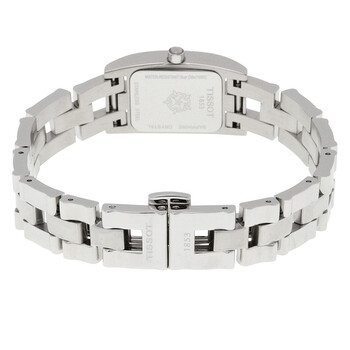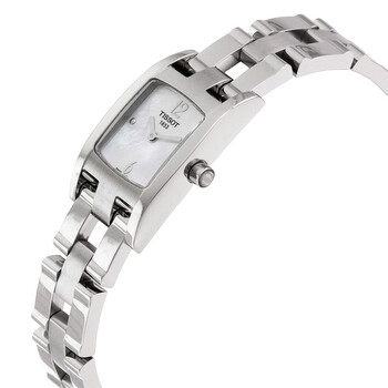 Stainless steel case with a stainless steel bracelet. Fixed stainless steel bezel. Mother of pearl dial with silver-tone hands. Arabic numerals mark the 6 and 12 o'clock positions. Dot markers at the 3 and 9 o'clock positions. Quartz movement. Scratch resistant sapphire crystal. Clear cabochon crown. Solid case back. Case diameter: 18 mm. Deployment clasp. Water resistant at 30 meters/ 100 feet. Functions: hours, minutes. Tissot T Trend T3 Mother of Pearl Ladies Watch T0421091111700.