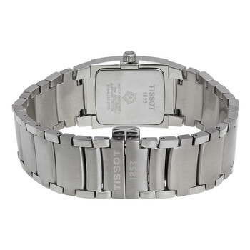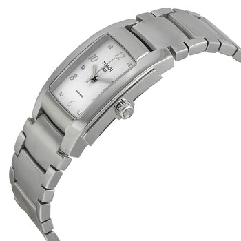 Stainless steel case with a stainless steel bracelet. Fixed stainless steel bezel. Silver dial with silver-tone hands and alternating Arabic numeral and pyramid hour markers. Dial Type: Analog. ETA Caliber F03.111 quartz movement. Scratch resistant sapphire crystal. Pull / push crown. Solid case back. Rectangle case shape. Case dimensions: 31.20 mm x 25.40 mm. Case thickness: 7.35 mm. Band width: 11 mm. Deployment clasp. Water resistant at 30 meters / 100 feet. Functions: hour, minute, second. Casual watch style. Watch label: Swiss Made. Item Variations: T0733101101701. Tissot T-10 Matte Stainless Steel Ladies Watch T073.310.11.017.01.