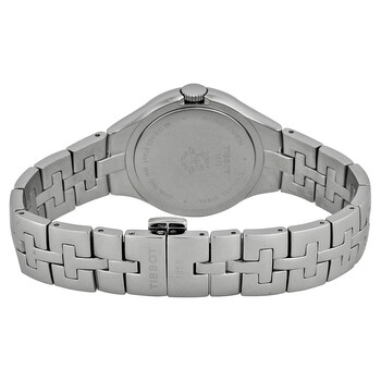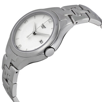 Stainless steel case with a stainless steel bracelet. Fixed stainless steel bezel. Silver dial with silver-tone hands and index hour markers. Arabic numerals mark the 3, 6, 9 and 12 o'clock positions. Dial Type: Analog. Date display at the 3 o'clock position. ETA caliber F04.111 quartz movement. Scratch resistant mineral crystal. Solid case back. Case size: 34 mm. Case thickness: 8.56 mm. Round case shape. Band width: 15 mm. Butterfly clasp. Water resistant at 30 meters / 100 feet. Functions: date, hour, minute, second. Casual watch style. Watch label: Swiss Made. Tissot T12 Trend Silver Dial Ladies Watch T0822101103700.