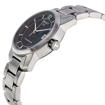 Grey titanium case with a grey titanium bracelet. Fixed grey titanium bezel. Black dial with silver-tone hands and index hour markers. Arabic numerals mark the 6 and 12 o'clock positions. Minute markers around the outer rim. Dial Type: Analog. Date display at the 3 o'clock position. Tissot calibre Powermatic 80 (C07.111) automatic movement, based upon ETA 2824-2, containing 23 Jewels, bitting at 21600 vph, and has a power reserve of approximately 80 hours. Scratch resistant sapphire crystal. Pull / push crown. Solid case back. Round case shape. Case size: 32 mm. Case thickness: 18 mm. Band width: 22 mm. Band length: 7 inches. Deployment clasp. Water resistant at 50 meters / 165 feet. Functions: date, hour, minute, second. T-classic Collection Series. Casual watch style. Watch label: Swiss Made. Tissot T-Classic Automatic Black Dial Titanium Ladies Watch T0872074405700.
