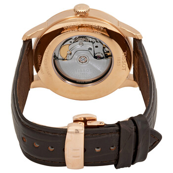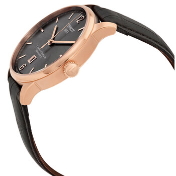Rose gold PVD stainless steel case with a brown leather strap. Fixed rose gold PVD bezel. Gunmetal dial with rose gold-tone hands and index hour markers. Arabic numerals appear at the 6 and 12 o'clock positions. Minute markers around the outer rim. Dial Type: Analog. Date display at the 6 o'clock position. Tissot Calibre Powermatic 80 (C07.111) automatic movement with an 80-hour power reserve. Scratch resistant sapphire crystal. Pull / push crown. Transparent case back. Round case shape. Case size: 42 mm. Case thickness: 10.9 mm. Band width: 21 mm. Butterfly clasp. Water resistant at 50 meters / 165 feet. Functions: date, hour, minute, second. Casual watch style. Watch label: Swiss Made. Tissot T-Classic Automatic Black Dial Men's Watch T099.407.36.447.00.