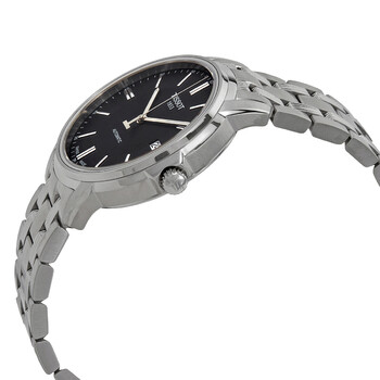 Stainless steel case with a stainless steel bracelet. Fixed stainless steel bezel. Black dial with luminous silver-tone hands and index hour markers. Minute markers around the outer rim. Dial Type: Analog. Luminescent hands and markers. Date display at the 3 o'clock position. ETA caliber 2824-2 automatic movement, based upon ETA 2824, containing 25 Jewels, bitting at 28800 vph, and has a power reserve of approximately 38 hours. Scratch resistant sapphire crystal. Pull / push crown. Solid case back. Round case shape. Case size: 39 mm. Case thickness: 9 mm. Band width: 19 mm. Butterfly clasp. Water resistant at 30 meters / 100 feet. Functions: date, hour, minute, second. T-classic automatic iii series. Casual watch style. Watch label: Swiss Made. Tissot T-Classic Automatic III Date Men's Watch T065.407.11.051.00.