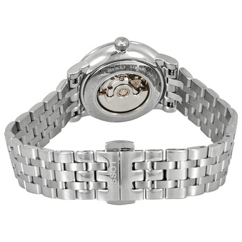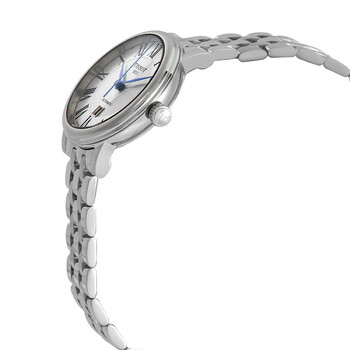 Stainless steel case with a stainless steel bracelet. Fixed stainless steel bezel. Silver dial with blue hands and Roman numeral hour markers. Dial Type: Analog. Date display above the 6 o'clock position. ETA caliber 2671 automatic movement, containing 25 Jewels, bitting at 28800 vph, and has a power reserve of approximately 38 hours. Scratch resistant sapphire crystal. Pull / push crown. Transparent case back. Round case shape. Cse size: 30 mm. Case thickness: 9.5 mm. Band width: 16 mm. Deployment clasp with a push button release. Water resistant at 50 meters / 165 feet. Functions: date, hour, minute, second. T-classic Series. Casual watch style. Watch label: Swiss Made. Tissot T-Classic Automatic Silver Dial Ladies Watch T122.207.11.033.00.