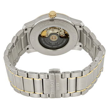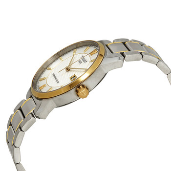 Titanium case with a titanium bracelet with Gold PVD links. Fixed gold PVD titanium bezel. Silver dial with gold-tone hands and index hour markers. Arabic numerals mark the 6 and 12 o'clock positions. Minute markers around the outer rim. Dial Type: Analog. Date display at the 3 o'clock position. Tissot calibre Powermatic 80 (C07.111) automatic movement with an 80-hour power reserve. Scratch resistant sapphire crystal. Pull / push crown. Transparent case back. Round case shape. Case size: 40 mm. Case thickness: 9 mm. Band width: 22 mm. Band length: 7 inches. Deployment clasp. Water resistant at 30 meters / 100 feet. Functions: date, hour, minute, second. Casual watch style. Watch label: Swiss Made. Tissot T-Classic Automatic Silver Dial Two-tone Men's Watch T0874075503700.