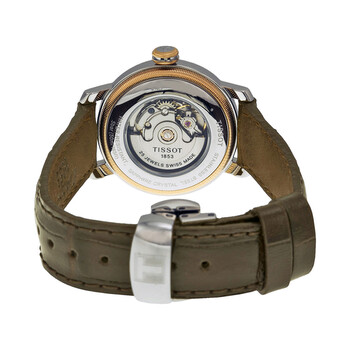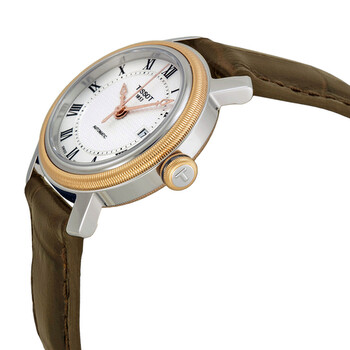 Stainless steel case with a brown leather strap. Fixed two-tone (silver and gold PVD) bezel. White dial with gold-tone hands and Roman numeral hour markers. Minute markers around an inner ring. Dial Type: Analog. Date display at the 3 o'clock position. ETA caliber 2671 automatic movement with a 38-hour power reserve. Scratch resistant sapphire crystal. Pull / push crown. Transparent case back. Case size: 29 mm. Case thickness: 8.7 mm. Round case shape. Band width: 14 mm. Band length: 6.75 inches. Butterfly clasp. Water resistant at 50 meters / 165 feet. Functions: date, hour, minute, second. Casual watch style. Watch label: Swiss Made. Item Variations: T097.007.26.033.00 T0970072603300. Tissot T-Classic Bridgeport White Dial Ladies Watch T0970072603300.