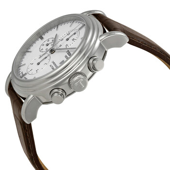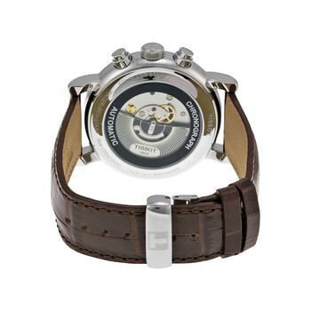 Stainless steel case with a brown leather strap. Fixed stainless steel bezel. Silver dial with silver-tone hands and index hour markers. Minute markers around the outer rim. Dial Type: Analog. Date display at the 3 o'clock position. Chronograph - three sub-dials displaying: 60 seconds, 30 minutes and 6 hours. Swiss automatic movement with a 46-hour power reserve. Scratch resistant sapphire crystal. Skeleton case back. Case diameter: 42.5 mm. Case thickness: 13 mm. Round case shape. Band width: 20 mm. Deployment clasp. Water resistant at 30 meters / 100 feet. Functions: chronograph, date, hour, minute, second. Casual watch style. Watch label: Swiss Made. Tissot T-Classic Carson Chronograph Automatic Silver Dial Men's Watch T0684271601100.