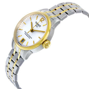 Stainless steel case with a two-tone (silver and yellow gold PVD) stainless steel bracelet. Fixed yellow gold PVD bezel. White dial with yellow gold PVD hands and index hour markers. An Arabic numeral appears at the 12 o'clock position. Minute markers around the outer rim. Dial Type: Analog. Date display at the 6 o'clock position. Tissot calibre Powermatic 80 (C07.111) automatic movement with an 80-hour power reserve. Scratch resistant sapphire crystal. Push / pull crown. Transparent case back. Round case shape. Case size: 32 mm. Case thickness: 10.69 mm. Band width: 16 mm. Fold over clasp with a push button release. Water resistant at 50 meters / 165 feet. Functions: date, hour, minute, second. Additional Info: suitable for use around household sinks playing sports and swimming in shallow water but not bathing snorkeling or scuba diving. Dress watch style. Watch label: Swiss Made. Tissot T-Classic Collection Automatic Ladies Watch T099.207.22.037.00.