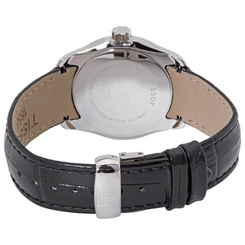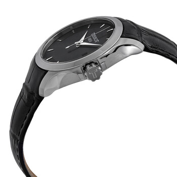 Stainless steel case with a black leather strap. Fixed stainless steel bezel. Black dial with silver-tone dauphine-style hands and index hour markers. Dial Type: Analog. Date display at the 3 o'clock position. ETA caliber F05.111 quartz movement. Scratch resistant sapphire crystal. Pull / push crown. Solid case back. Round case shape. Case size: 32 mm. Case thickness: 8.1 mm. Band width: 18 mm. Butterfly clasp. Water resistant at 100 meters / 330 feet. Functions: date, hour, minute, second. T-classic couturier series. Casual watch style. Watch label: Swiss Made. Tissot T-Classic Couturier Quartz Black Dial Ladies Watch T035.210.16.051.01.