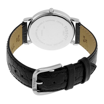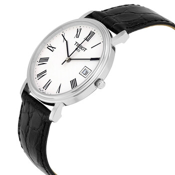 Stainless steel case with a black leather strap. Fixed stainless steel bezel. White dial with black hands and Roman numeral hour markers. Minute markers around the outer rim. Dial Type: Analog. Date display at the 3 o'clock position. ETA caliber F06.111 quartz movement. Scratch resistant sapphire crystal. Pull / push crown. Solid case back. Case size: 34 mm. Case thickness: 6 mm. Round case shape. Band width: 18 mm. Band length: 7.5 inches. Tang clasp. Water resistant at 30 meters / 100 feet. Functions: date, hour, minute, second. Casual watch style. Watch label: Swiss Made. Tissot T-Classic Desire White Dial Black Leather Men's Watch T52142113.