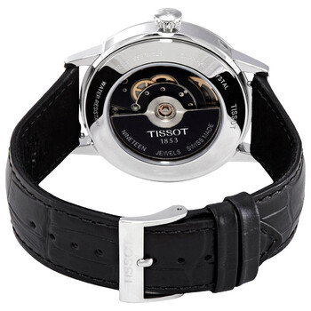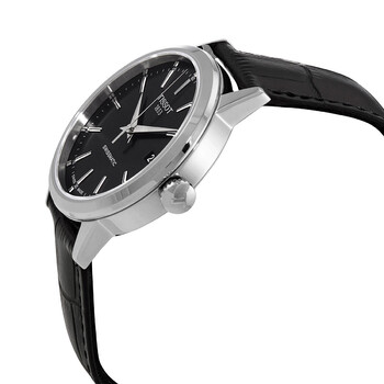 Stainless steel case with a black leather strap. Fixed stainless steel bezel. Black dial with silver-tone hands and index hour markers. Arabic numeral minute markers (at 5 minute intervals). Minute markers around the outer rim. Dial Type: Analog. Date display at the 3 o'clock position. Automatic movement with a 72-hour power reserve. Scratch resistant sapphire crystal. Pull / push crown. Transparent case back. Round case shape. Case size: 42 mm. Case thickness: 11.5 mm. Band width: 22 mm. Tang clasp. Water resistant at 50 meters / 165 feet. Functions: date, hour, minute, second. T-classic Dream Series. Dress watch style. Watch label: Swiss Made. Tissot T-Classic Dream Automatic Black Dial Men's Watch T129.407.16.051.00.