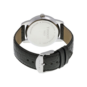 Stainless steel case with a black leather strap. Fixed stainless steel bezel. Black dial with skeletal hands and Roman numeral hour markers. Minute markers around the outer rim. Luminescent hands and markers. Date display appears at the 3 o'clock position. Quartz movement. Scratch resistant sapphire crystal. Steel crown. Solid case back. Case diameter: 38 mm. Case thickness: 8 mm. Tang clasp. Water resistant at 30 meters / 100 feet. Functions: hours, minutes, seconds, date. Tissot T-Classic Dream Black Dial Men's Watch T033.410.16.053.00