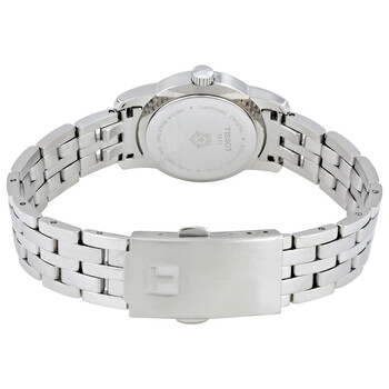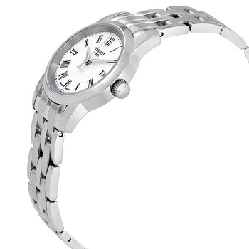 Stainless steel case with a stainless steel bracelet. Fixed stainless steel bezel. White dial with luminous silver-tone hands and black Roman numeras hour markers. Minute markers around the outer rim. Dial Type: Analog. Luminescent hands and dial markers. Date display at the 3 o'clock position. Quartz movement. Scratch resistant sapphire crystal. Pull / push crown. Stainless steel case back. Case diameter: 28 mm. Case thickness: 8 mm. Round case shape. Band width: 17.8 mm. Band length: 7 inches. Fold over clasp with a safety release. Water resistant at 30 meters / 100 feet. Functions: date, hour, minute, second. Additional Info: in general, withstands splashes or brief immersion in water, but not suitable for swimming.. Casual watch style. Watch label: Swiss made. Item Variations: T0332101101300. Tissot T-Classic Dream White Dial Stainless Steel Ladies Watch T033.210.11.013.00.