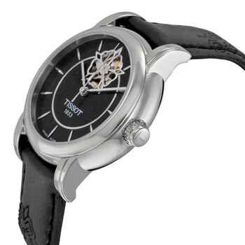 Stainless steel case with a black synthetic leather strap. Fixed stainless steel bezel. Black dial with silver-tone hands and index hour markers. Dial Type: Analog. Tissot Calibre Powermatic 80.601 automatic movement with an 80-hour power reserve. Scratch resistant sapphire crystal. Skeleton case back. Case size: 35 mm. Case thickness: 9.35 mm. Round case shape. Band width: 16 mm. Deployment clasp with a push button release. Water resistant at 30 meters / 100 feet. Functions: hour, minute, second. Casual watch style. Watch label: Swiss Made. Tissot T-Classic Lady Heart Automatic Ladies Watch T0502071705104.