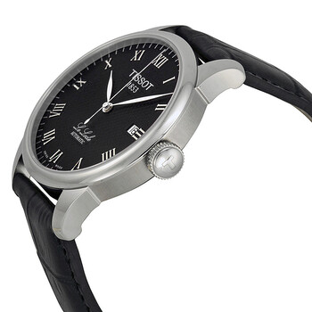 Stainless steel case with a black leather strap. Fixed stainless steel bezel. Black dial with silver-tone hands and Roman numeral hour markers. Minute markers around the outer rim. Dial Type: Analog. Date display at the 3 o'clock position. ETA 2824-2 automatic movement with a 38-hour power reserve. Scratch resistant sapphire crystal. Pull / push crown. Skeleton case back. Case size: 39 mm. Case thickness: 9.75 mm. Round case shape. Band width: 20 mm. Band length: 7 inches. Deployment clasp. Water resistant at 30 meters / 100 feet. Functions: hours, minutes, seconds, calendar. Casual watch style. Watch label: Swiss Made. Item Variations: T41 1 423 53, T41-1-423-53, T41/1/423/53, T41142353. Tissot T-Classic Le Locle Automatic Men's Watch T41.1.423.53.