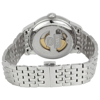 Stainless steel case with a stainless steel link bracelet. Fixed stainless steel bezel. Black guilloche dial with silver-tone hands and Roman numeral hour markers. Luminescent minute markers around the outer rim. Date display at the 3 o'clock position. Automatic movement. Scratch resistant sapphire crystal. Skeletal case back. Power reserve indicator. Case diameter: 39 mm. Case thickness: 10.5 mm. Deployment clasp. Water resistant at 30 meters / 100 feet. Tissot T-Classic Le Locle Automatic Power Reserve Men's Watch T006.424.11.053.00.