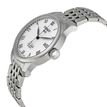 Stainless steel case with a stainless steel link bracelet. Fixed stainless steel bezel. Silver guilloche dial with steel hands and Roman numeral hour markers. Minute markers around the outer rim. Date display at the 3 o'clock position. Automatic movement with a 38-hour power reserve. Scratch resistant sapphire crystal. Textured steel crown. Skeleton case back. Case diameter: 39 mm. Case thickness: 10 mm. Deployment clasp. Water resistant at 30 meters (100 feet). Functions: hours, minutes, seconds, date. Tissot T-Classic Le Locle Men's Watch T41.1.483.33.