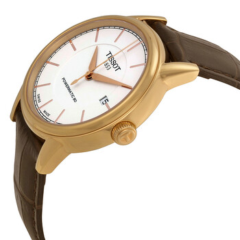 Rose gold PVD stainless steel case with a brown leather strap. Fixed rose gold PVD bezel. White dial with rose gold-tone hands and index hour markers. Minute markers around the outer rim. Dial Type: Analog. Date display at the 3 o'clock position. Tissot calibre Powermatic 80 (C07.111) automatic movement with an 80-hour power reserve. Scratch resistant sapphire crystal. Pull / push crown. Skeleton case back. Round case shape, case size: 40 mm, case thickness: 10 mm. Band width: 20 mm. Tang clasp. Water resistant at 30 meters / 100 feet. Functions: date, hour, minute, second. Casual watch style. Watch label: Swiss Made. Tissot T-Classic Powermatic White Dial Men's Watch T0854073601100.