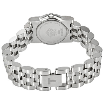 Stainless steel case with a stainless steel bracelet. Fixed stainless steel bezel. Black dial with silver-tone hands and index (even) hour markers. Arabic numeral markers at the 6 and 12 o'clock positions. Dial Type: Analog. ETA Caliber 901.001 quartz movement. Scratch resistant sapphire crystal. Pull / push crown. Solid case back. Round case shape. Case size: 25.4 mm. Case thickness: 6 mm. Band width: 13.5 mm. Deployment clasp. Water resistant at 30 meters / 100 feet. Functions: hour, minute. T-classic Series. Dress watch style. Watch label: Swiss Made. Tissot T-Classic Quartz Black Dial Ladies Watch T030.009.11.057.00.