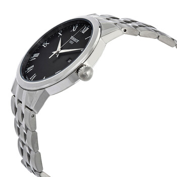 316L stainless steel case with a stainless steel bracelet. Fixed 316L stainless steel bezel. Black dial with silver-tone hands and Roman numeral hour markers. Arabic numeral minute markers (at 5 minute intervals). Minute markers around the outer rim. Dial Type: Analog. Date display at the 3 o'clock position. ETA caliber F06.115 quartz movement. Scratch resistant sapphire crystal. Solid case back. Round case shape. Case size: 42 mm. Case thickness: 8.1 mm. Band width: 22 mm. Butterfly clasp. Water resistant at 50 meters / 165 feet. Functions: date, hour, minute, second, battery eol indicator. T-classic Series. Dress watch style. Watch label: Swiss Made. Tissot T-Classic Quartz Black Dial Men's Watch T129.410.11.053.00.