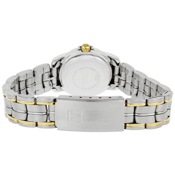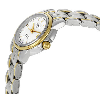 Two-tone stainless steel case with a two-tone stainless steel bracelet. Fixed bezel. White dial with gold-tone hands and index hour markers. Minute markers, around the outer rim. Date display appears at the 3 o'clock position. Automatic movement. Scratch resistant sapphire crystal. Case diameter: 25 mm. Case thickness: 8 mm. Fold-over clasp. Water resistant at 30 meters (100 feet). Functions: hours, minutes, seconds, date. Tissot T-Classic Seastar II Automatic Watch T55.0.283.11.