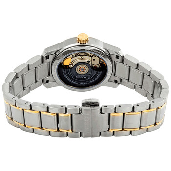 Grey titanium case with a two-tone (grey and gold PVD) titanium bracelet. Fixed gold PVD titanium bezel. Silver and white mother of pearl dial with gold-tone hands and index hour markers. Arabic numerals mark the 6 and 12 o'clock positions. Minute markers around the outer rim. Dial Type: Analog. Date display at the 3 o'clock position. Tissot calibre Powermatic 80 (C07.111) automatic movement with an 80-hour power reserve. Scratch resistant sapphire crystal. Pull / push crown. Transparent case back. Round case shape. Case size: 32 mm. Case thickness: 9.55 mm. Band width: 22 mm. Band length: 7 inches. Deployment clasp. Water resistant at 50 meters / 165 feet. Functions: date, hour, minute, second. Casual watch style. Watch label: Swiss Made. Tissot T-Classic Titanium Automatic Mother of Pearl Dial Ladies Watch T0872075511700.