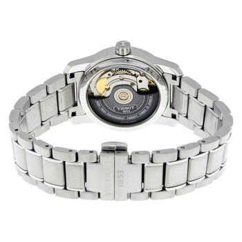 Titanium case with a grey titanium bracelet. Fixed titanium bezel. Silver dial with silver-tone hands and index hour markers. Arabic numerals mark the 6 and 12 o'clock positions. minute markers around the outer rim. Dial Type: Analog. Date display at the 3 o'clock position. Tissot calibre Powermatic 80 (C07.111) automatic movement with an 80-hour power reserve. Scratch resistant sapphire crystal. Pull / push crown. Transparent case back. Case size: 32 mm. Case thickness: 9.55 mm. Round case shape. Band width: 22 mm. Band length: 7 inches. Deployment clasp. Water resistant at 50 meters / 165 feet. Functions: date, hour, minute, second. Casual watch style. Watch label: Swiss Made. Tissot T-Classic Titanium Automatic Silver Dial Ladies Watch T0872074403700.