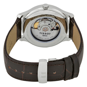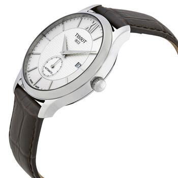 Stainless steel case with a brown leather strap. Fixed stainless steel bezel. Silver dial with silver-tone dauphine-style shape hands and index hour markers. A Roman numeral appears at the 12 o'clock position. minute markers around the outer rim. Dial Type: Analog. Date display at the 3 o'clock position. Small seconds sub-dial. ETA caliber 2825-2 automatic movement, based upon ETA 2824-2, containing 25 Jewels, bitting at 28800 vph, and has a power reserve of approximately 42 hours. Scratch resistant sapphire crystal. Pull / push crown. Transparent case back. Round case shape. Case size: 40 mm. Case thickness: 11.2 mm. Band width: 20 mm. Deployment clasp. Water resistant at 30 meters / 100 feet. Functions: date, hour, minute, small second. Dress watch style. Watch label: Swiss Made. Tissot T-Classic Tradition Automatic Men's Watch T063.428.16.038.00.