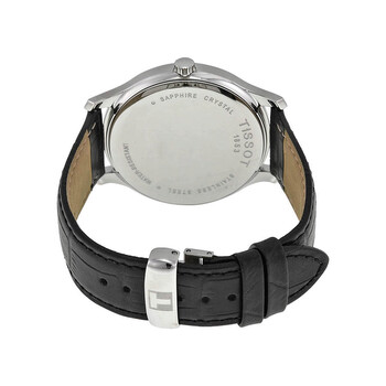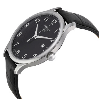 Stainless steel case with a black leather strap. Fixed stainless steel bezel. Black dial with silver-tone hands and Arabic numeral hour markers. Minute markers around the outer rim. Dial Type: Analog. Date display appears at the 3 o'clock position. Quartz movement. Scratch resistant sapphire crystal. Pull / push crown. Solid case back. Case diameter: 42 mm. Case thickness: 8 mm. Round case shape. Band width: 20 mm. Deployment clasp. Water resistant at 30 meters / 100 feet. Functions: hours, minutes, seconds, calendar. Casual watch style. Watch label: Swiss made. Tissot T-Classic Tradition Men's Watch T0636101605200.