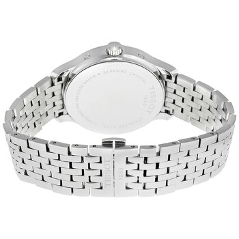 Stainless steel case with a stainless steel bracelet. Fixed stainless steel bezel. White dial with silver-tone hands and index hour markers. An Arabic numeral marks the 12 o'clock position. Minute markers around the outer rim. Dial Type: Analog. Four displays showing: seconds, date, month and day of the week. Quartz movement. Scratch resistant sapphire crystal. Pull / push crown. Solid case back. Case diameter: 42 mm. Case thickness: 11.07 mm. Round case shape. Band width: 22.9 mm. Band length: 7 inches. Fold over deployment clasp. Water resistant at 30 meters / 100 feet. Functions: perpetual, hour, minute, second. Casual watch style. Watch label: Swiss Made. Tissot T-Classic Tradition Multi-Function White Dial Stainless Steel Perpetual Calendar Men's Watch T0636371103700.