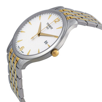 Silver-tone stainless steel case with a two-tone (silver-tone and gold PVD) stainless steel bracelet. Fixed stainless steel bezel. White dial with gold-tone hands and index hour markers. Arabic numerals mark the 6 and 12 o'clock positions. Minute markers around the outer rim. Dial Type: Analog. Date display at the 3 o'clock position. ETA Caliber F06.111 quartz movement. Scratch resistant sapphire crystal. Pull / push crown. Solid case back. Case size: 42 mm. Case thickness: 8 mm. Round case shape. Band width: 22.9 mm. Band length: 9 inches. Fold over clasp. Water resistant at 30 meters / 100 feet. Functions: date, hour, minute, second. Casual watch style. Watch label: Swiss Made. Tissot T-Classic Tradition White Dial Men's Watch T0636102203700.