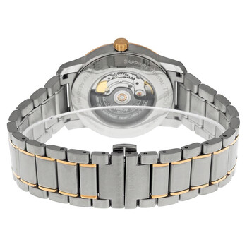 Titanium case with a titanium bracelet with rose gold PVD accents. Fixed rose gold PVD bezel. Black dial with rose gold-tone hands and index hour markers. Arabic numerals mark the 6 and 12 o'clock positions. Minute markers around the outer rim. Dial Type: Analog. Date display at the 3 o'clock position. Automatic movement with an 80-hour power reserve. Scratch resistant sapphire crystal. Skeleton case back. Case diameter: 40 mm. Case thickness: 10 mm. Round case shape. Band width: 17.8 mm. Band length: 7 inches. Fold over deployment clasp. Water resistant at 50 meters / 165 feet. Functions: date, hour, minute, second. Casual watch style. Tissot T-Classic Automatic Black Dial Two-Tone Titanium Men's Watch T0874075506700.