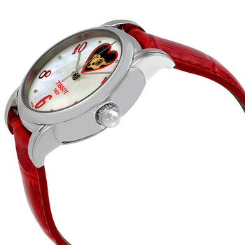 Stainless steel case with a red leather strap. Fixed stainless steel bezel. White mother of pearl (heart) dial with silver-tone hands and alternating diamond and Arabic numeral hour markers. Dial Type: Analog. ETA caliber 2824-2 automatic movement with a 38-hour power reserve. Scratch resistant sapphire crystal. Pull / push crown. Solid case back. Case size: 35 mm. Case thickness: 9.35 mm. Round case shape. Band width: 16 mm. Deployment clasp with a push button release. Water resistant at 30 meters / 100 feet. Functions: hour, minute, second. Additional Info: withstands rain and splashes of water, but not showering or submersion. Dress watch style. Watch label: Swiss Made. Item Variations: T050 207 16 116 02, T050-207-16-116-02, T050/207/16/116/02, T0502071611602. Tissot T-Classic White Mother Of Pearl Dial Red Leather Ladies Heart Watch T050.207.16.116.02.